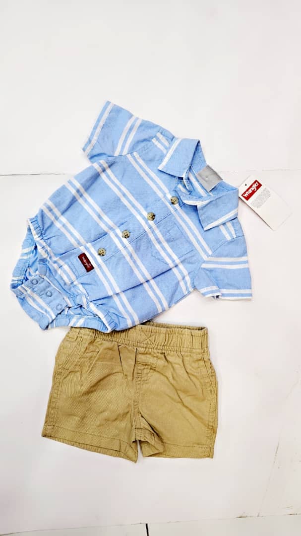 Keep him looking smart and comfy in this 2-in-1 Wrangler baby boy set — a striped shirt (blue or peach) paired with soft nude chinos shorts. Perfect for every little outing! 💙🧡