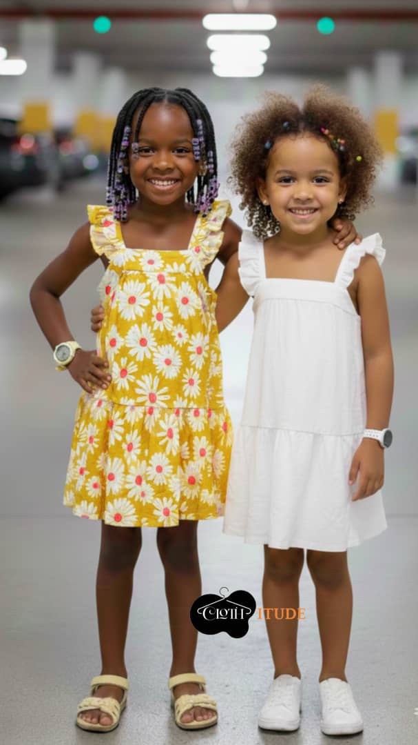 Description – A 2 pack fluttered sleeveless gown consisting of a yellow floral gown and a plain white gown.