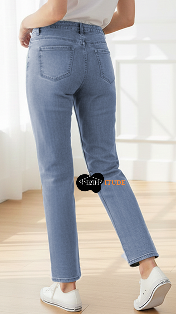 Description – it’s a straight blue jeans with a pearl love design on the thigh, jeans, two large and mini front pockets.