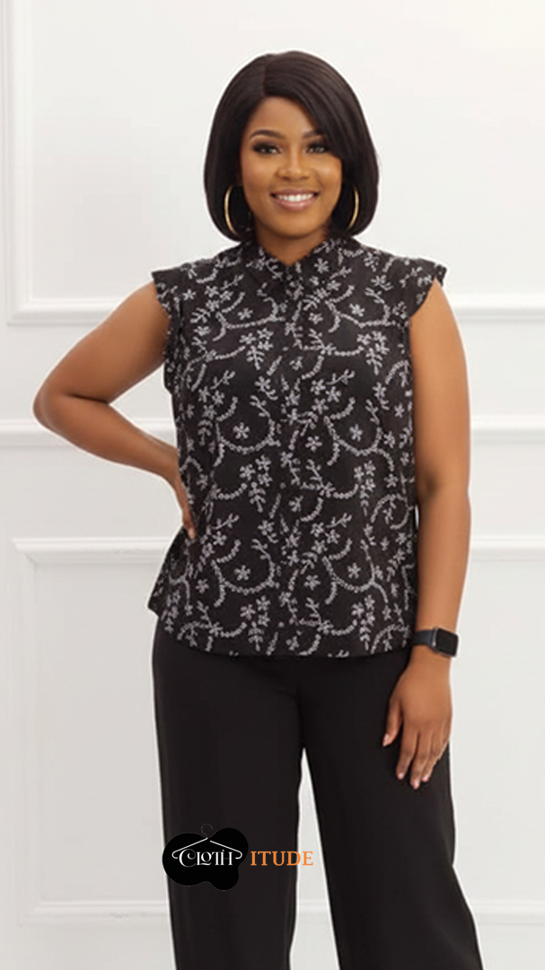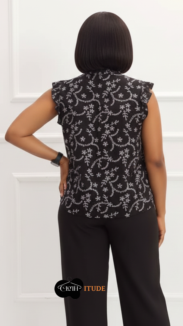 Description – it’s a chiffon black and white top with shoulder lenght sleeves.