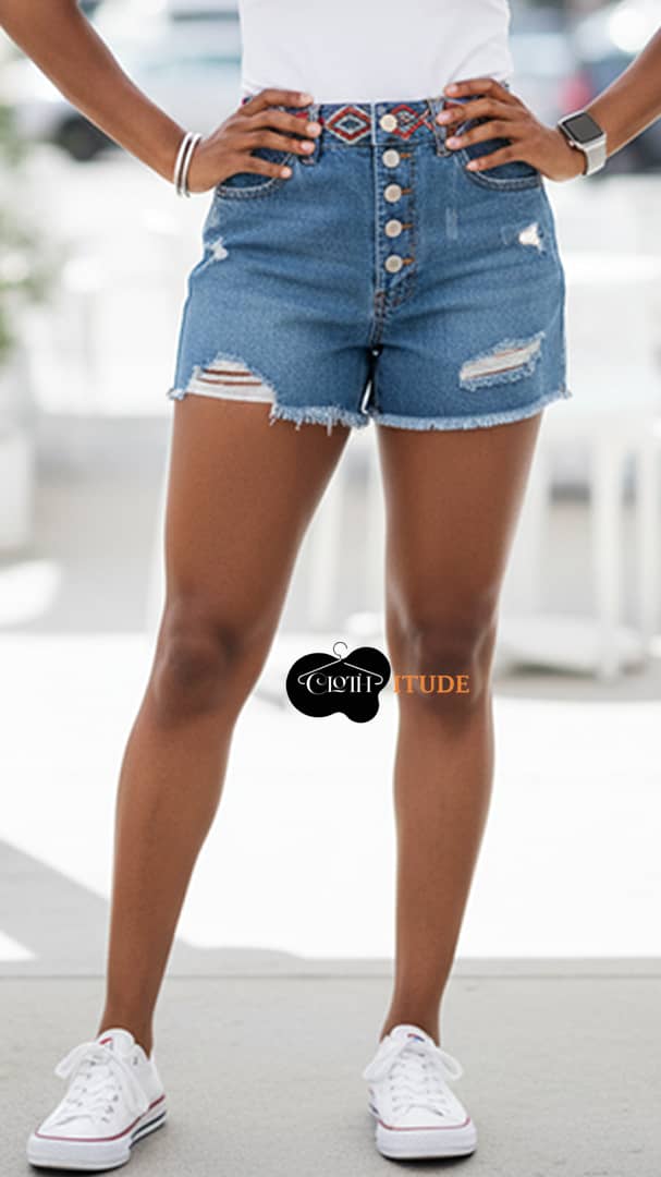 Description – it’s a crazy short blue jeans with five button perfect for your beach outing. It has two front pockets and two back pockets.