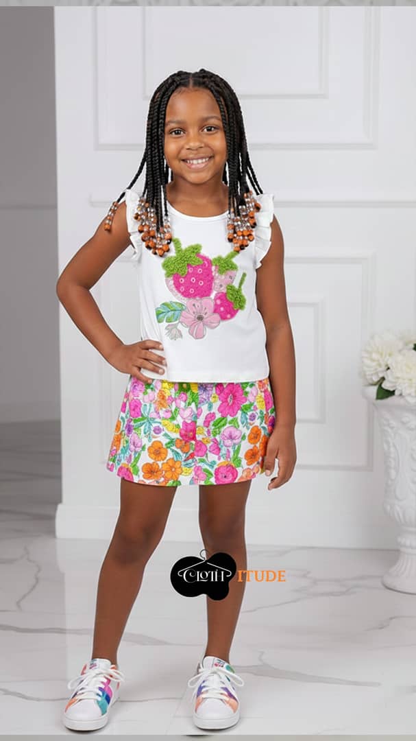 Description – it’s a 2 piece set consisting of a multicolor floral pleated skirt and a matching white base fruit design top.